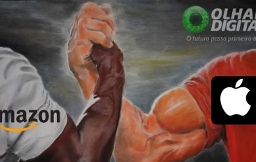 Ilustração de aperto de mão entre homens musculosos com logos da Amazon e da Apple colocados em cima de cada um
