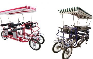 E-bike para quatro pessoas é uma criação chinesa que lembra os primeiros carros; mas seu preço também é família