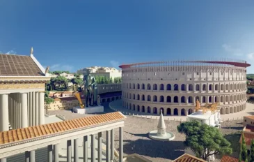 O modelo virtual da Roma Antiga permite que os espectadores sobrevoem o Coliseu, o Panteão, termas e casas de banho