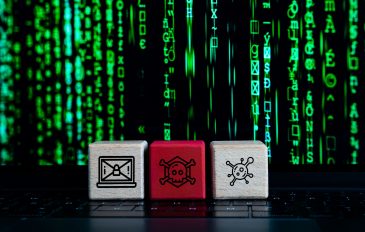 Cubinhos com desenhos de vírus, perigo e desinformação colocados em cima de teclado de notebook cuja tela mostra imagem de caracteres verdes na vertical estilo Matrix