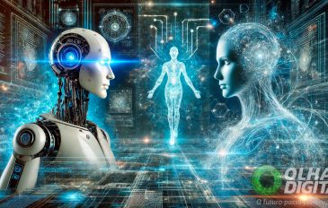 Ilustração de modelos de inteligência artificial se encarando em ambiente virtual