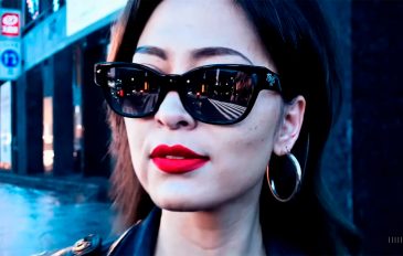 Cena de mulher de óculos escuro em cidade gerada no Sora