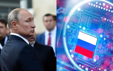 Montagem com imagens de Vladimir Putin e de chip da Rússia