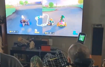 Nolan Arbaugh aparece sentado à frente da TV enquanto controla o personagem no jogo, sem as mãos e com a força da mente